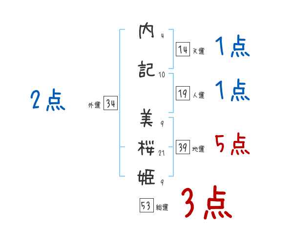 地運![]() | 内記美桜姫さんの地運は39画の5つ星!社交性に優れ人望が厚い。人の上に立ち成功する。 個性を表す基礎的な運勢です。性格形成や対人関係、行動力など家庭環境に影響されます。主に誕生してから20歳くらいまでの若年期の運勢を表します。 |