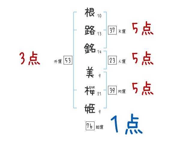 外運![]() | 根路銘美桜姫さんの外運は53画の3つ星!やや見栄っ張りで虚栄心がある。散財に注意。 生活面を象徴する運勢です。外部から受ける影響力を表し、結婚運、家庭運や職場、環境への順応性を表します。 |