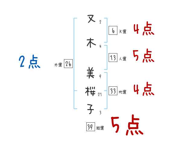 総運![]() | 又木美桜子さんの総運は39画の5つ星!社交性に優れ人望が厚い。人の上に立ち成功する。 あなたの人生を表す1番重要な運勢です。生涯を通じて影響する総合運となり、主に50歳以降の晩年期に影響を及ぼします。 |