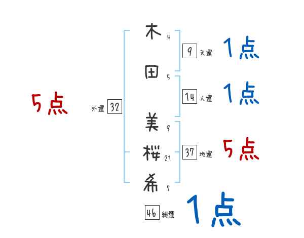 外運![]() | 木田美桜希さんの外運は32画の5つ星!柔軟性があり成功する。チャンスが多く金運が良い。 生活面を象徴する運勢です。外部から受ける影響力を表し、結婚運、家庭運や職場、環境への順応性を表します。 |
