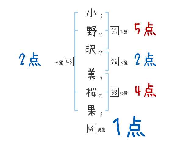 総運![]() | 小野沢美桜果さんの総運は69画の1つ星!不満を感じやすい傾向が。ストレスを貯めないように注意しましょう。 あなたの人生を表す1番重要な運勢です。生涯を通じて影響する総合運となり、主に50歳以降の晩年期に影響を及ぼします。 |