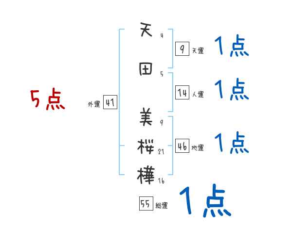 天運![]() | 天田美桜樺さんの天運は9画の1つ星!消極的で才能を発揮することが苦手なことも。周りの意見に耳を傾けましょう。 家系が持つ宿命的な運勢を表します。祖先から受け継いだ苗字ですので自分の力が及びません。家柄を象徴します。 |