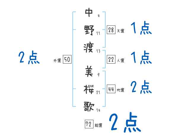 天運![]() | 中野渡美桜歌さんの天運は28画の1つ星!家庭環境に注意。スポーツで活躍できる能力があるかも。 家系が持つ宿命的な運勢を表します。祖先から受け継いだ苗字ですので自分の力が及びません。家柄を象徴します。 |
