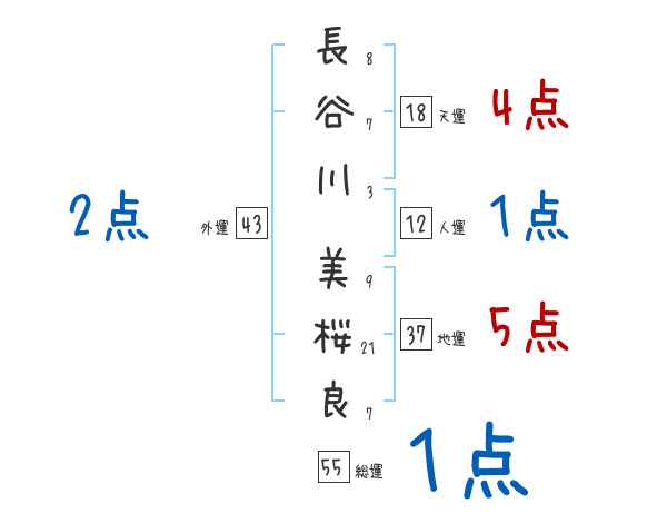 天運![]() | 長谷川美桜良さんの天運は18画の4つ星!情熱的で剛気。忍耐力があり信頼される。 家系が持つ宿命的な運勢を表します。祖先から受け継いだ苗字ですので自分の力が及びません。家柄を象徴します。 |