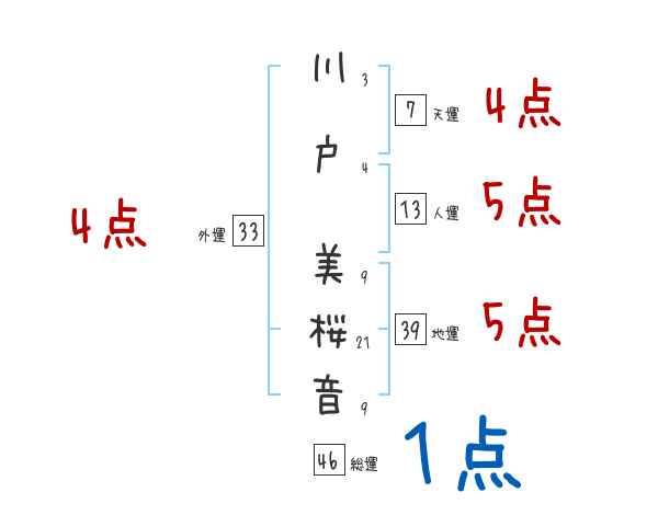 外運![]() | 川戸美桜音さんの外運は33画の4つ星!権力志向でプライドが高い。勇気があり運を切り開き成功する。 生活面を象徴する運勢です。外部から受ける影響力を表し、結婚運、家庭運や職場、環境への順応性を表します。 |