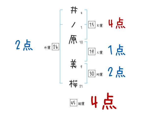 総運![]() | 井ノ原美桜さんの総運は45画の4つ星!もくもくと物事を進め達成する。地味な努力家。 あなたの人生を表す1番重要な運勢です。生涯を通じて影響する総合運となり、主に50歳以降の晩年期に影響を及ぼします。 |