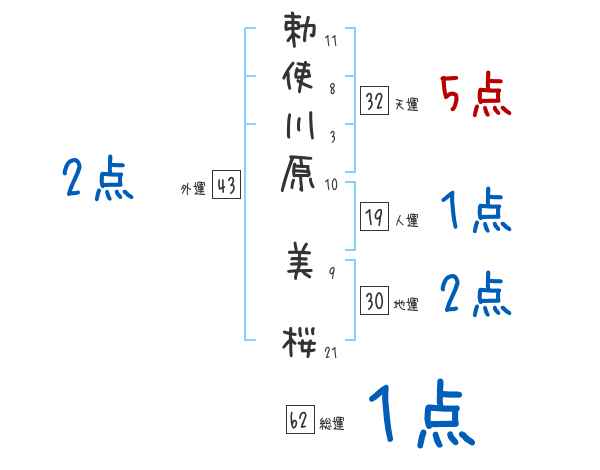 天運![]() | 勅使川原美桜さんの天運は32画の5つ星!柔軟性があり成功する。チャンスが多く金運が良い。 家系が持つ宿命的な運勢を表します。祖先から受け継いだ苗字ですので自分の力が及びません。家柄を象徴します。 |