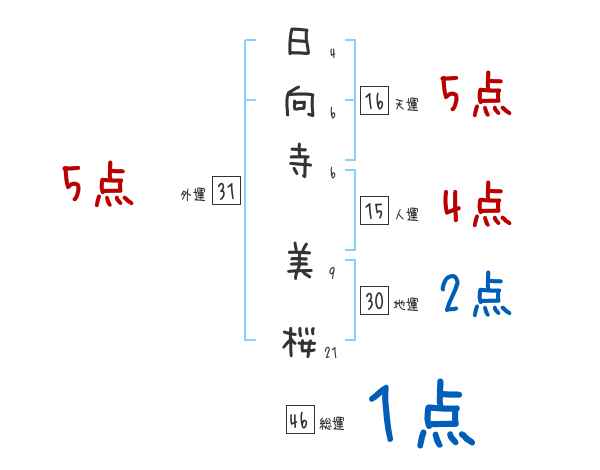 外運![]() | 日向寺美桜さんの外運は31画の5つ星!社交性があり判断力に優れる。順風満帆な人生で円満な生活。 生活面を象徴する運勢です。外部から受ける影響力を表し、結婚運、家庭運や職場、環境への順応性を表します。 |