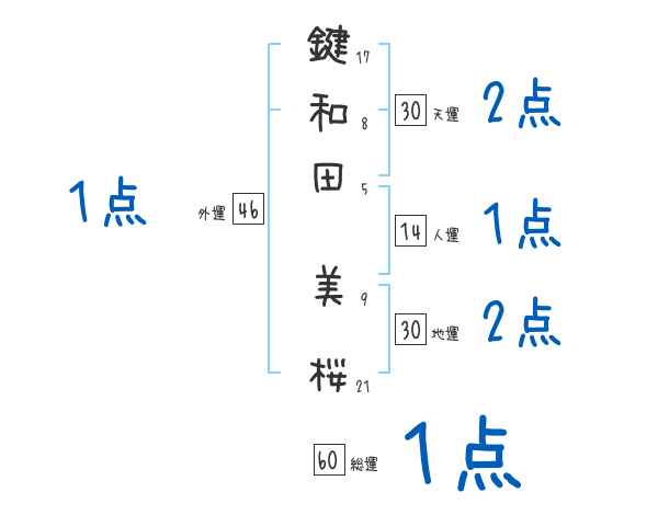 天運![]() | 鍵和田美桜さんの天運は30画の2つ星!浮き沈みの激しさに注意しましょう。 家系が持つ宿命的な運勢を表します。祖先から受け継いだ苗字ですので自分の力が及びません。家柄を象徴します。 |