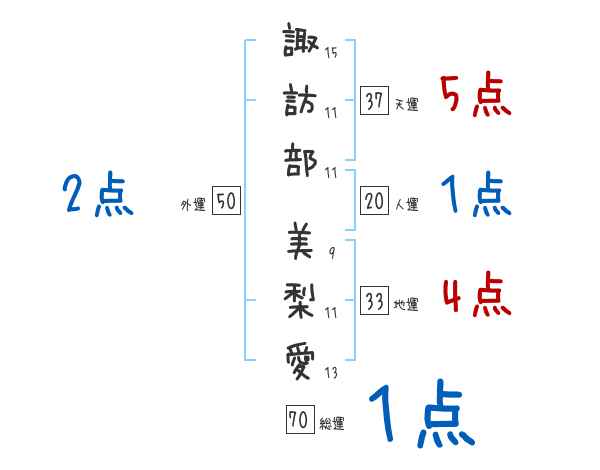 人運![]() | 諏訪部美梨愛さんの人運は20画の1つ星!社交が苦手。人とは違った才能があり波乱万丈な人生かも。 性格や才能などを表す2番目に重要な運勢です。人間関係や協調性、社会的な成功に影響します。主に20歳から50歳ぐらいまでの中年期の運勢を表します。 |