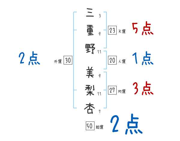 | 天運  | 三重野美梨杏さんの天運は23画の5つ星!想像力に優れ活力がある。一代で成功し名誉を手に入れる。家系が持つ宿命的な運勢を表します。祖先から受け継いだ苗字ですので自分の力が及びません。家柄を象徴します。 |