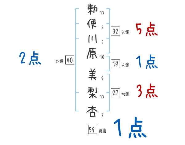 天運![]() | 勅使川原美梨杏さんの天運は32画の5つ星!柔軟性があり成功する。チャンスが多く金運が良い。 家系が持つ宿命的な運勢を表します。祖先から受け継いだ苗字ですので自分の力が及びません。家柄を象徴します。 |