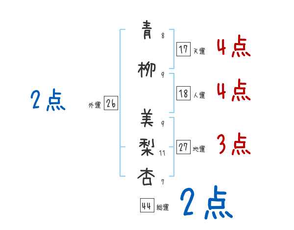 外運![]() | 青栁美梨杏さんの外運は26画の2つ星!波瀾万丈かも。信頼できる人を大事にしましょう。 生活面を象徴する運勢です。外部から受ける影響力を表し、結婚運、家庭運や職場、環境への順応性を表します。 |