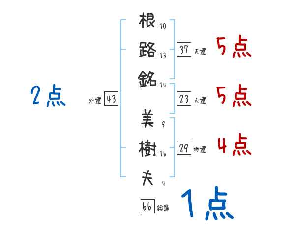 地運![]() | 根路銘美樹夫さんの地運は29画の4つ星!完全主義で才能がある。厳格な心の持ち主。 個性を表す基礎的な運勢です。性格形成や対人関係、行動力など家庭環境に影響されます。主に誕生してから20歳くらいまでの若年期の運勢を表します。 |