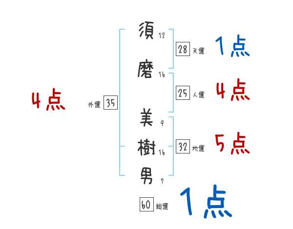 外運![]() | 須磨美樹男さんの外運は35画の4つ星!温厚な性格で感受性が高い。穏和な性格で人望が厚い。 生活面を象徴する運勢です。外部から受ける影響力を表し、結婚運、家庭運や職場、環境への順応性を表します。 |