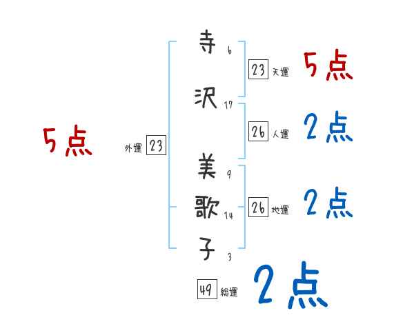外運![]() | 寺沢美歌子さんの外運は23画の5つ星!想像力に優れ活力がある。一代で成功し名誉を手に入れる。 生活面を象徴する運勢です。外部から受ける影響力を表し、結婚運、家庭運や職場、環境への順応性を表します。 |