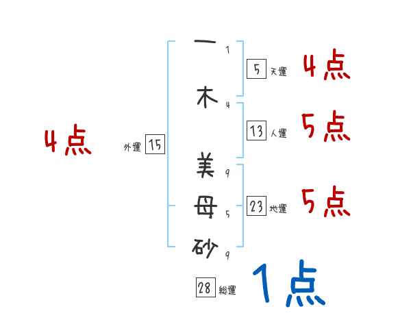 天運![]() | 一木美母砂さんの天運は5画の4つ星!健康で安泰。協調性に優れ、財産に恵まれる。 家系が持つ宿命的な運勢を表します。祖先から受け継いだ苗字ですので自分の力が及びません。家柄を象徴します。 |