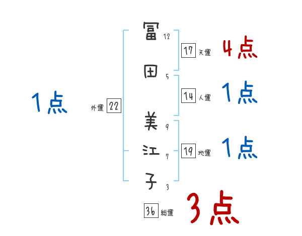 | 外運  | 冨田美江子さんの外運は22画の1つ星!努力することが苦手ないっぽう手先が器用。芸術性にも優れる。生活面を象徴する運勢です。外部から受ける影響力を表し、結婚運、家庭運や職場、環境への順応性を表します。 |