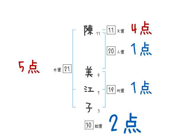 天運![]() | 陳美江子さんの天運は11画の4つ星!着実に富や地位を得る幸運な人生。 家系が持つ宿命的な運勢を表します。祖先から受け継いだ苗字ですので自分の力が及びません。家柄を象徴します。 |