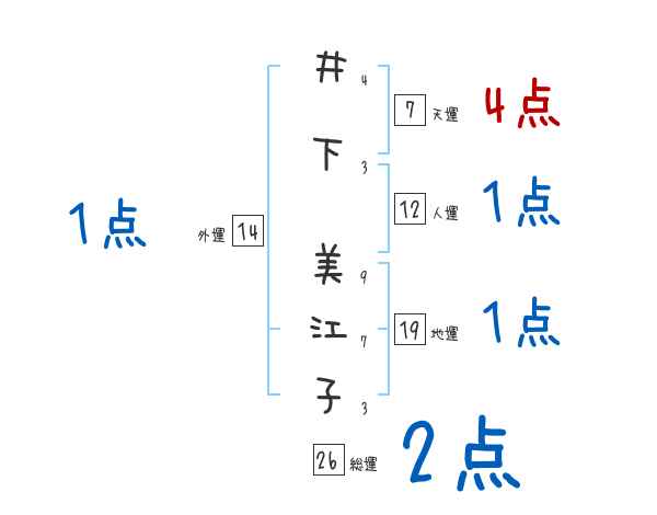 天運![]() | 井下美江子さんの天運は7画の4つ星!強い意志や信念を持ち独立心が強い。自立する。 家系が持つ宿命的な運勢を表します。祖先から受け継いだ苗字ですので自分の力が及びません。家柄を象徴します。 |