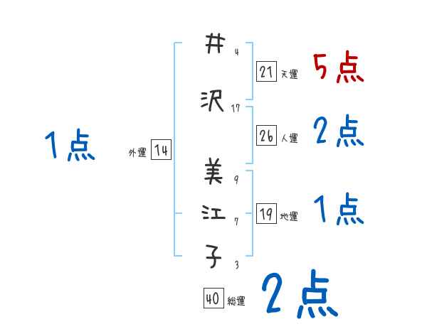 外運![]() | 井沢美江子さんの外運は14画の1つ星!人に対して優しいがストレスを溜め込みがち。人間関係のトラブルを避けるよう気をつけましょう。 生活面を象徴する運勢です。外部から受ける影響力を表し、結婚運、家庭運や職場、環境への順応性を表します。 |