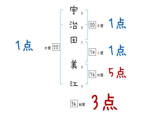 外運![]() | 宇治田美江さんの外運は22画の1つ星!努力することが苦手ないっぽう手先が器用。芸術性にも優れる。 生活面を象徴する運勢です。外部から受ける影響力を表し、結婚運、家庭運や職場、環境への順応性を表します。 |
