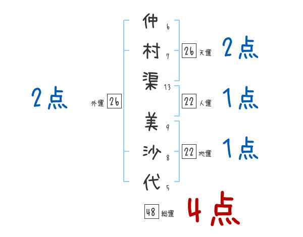 人運![]() | 仲村渠美沙代さんの人運は22画の1つ星!努力することが苦手ないっぽう手先が器用。芸術性にも優れる。 性格や才能などを表す2番目に重要な運勢です。人間関係や協調性、社会的な成功に影響します。主に20歳から50歳ぐらいまでの中年期の運勢を表します。 |