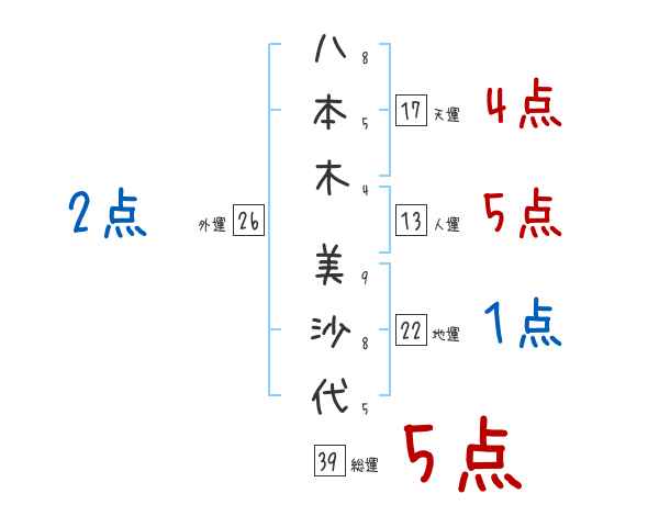 外運![]() | 八本木美沙代さんの外運は26画の2つ星!波瀾万丈かも。信頼できる人を大事にしましょう。 生活面を象徴する運勢です。外部から受ける影響力を表し、結婚運、家庭運や職場、環境への順応性を表します。 |