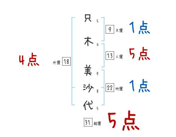 天運![]() | 只木美沙代さんの天運は9画の1つ星!消極的で才能を発揮することが苦手なことも。周りの意見に耳を傾けましょう。 家系が持つ宿命的な運勢を表します。祖先から受け継いだ苗字ですので自分の力が及びません。家柄を象徴します。 |