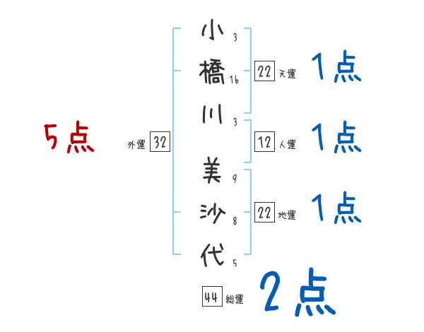 外運![]() | 小橋川美沙代さんの外運は32画の5つ星!柔軟性があり成功する。チャンスが多く金運が良い。 生活面を象徴する運勢です。外部から受ける影響力を表し、結婚運、家庭運や職場、環境への順応性を表します。 |