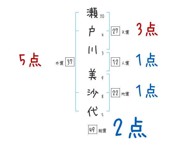 天運![]() | 瀬戸川美沙代さんの天運は27画の3つ星!頭脳明晰だが強情で摩擦が多い傾向。孤立に注意。 家系が持つ宿命的な運勢を表します。祖先から受け継いだ苗字ですので自分の力が及びません。家柄を象徴します。 |