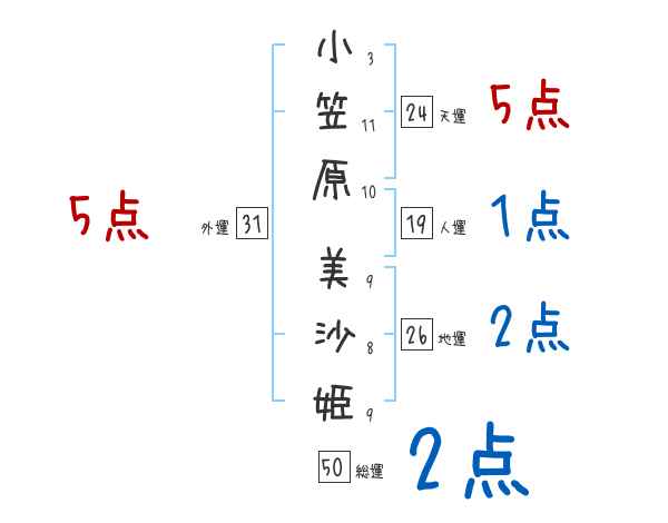 総運![]() | 小笠原美沙姫さんの総運は50画の2つ星!浮き沈みが激しく不安定。しりすぼみに衰退しやすいので注意しましょう。 あなたの人生を表す1番重要な運勢です。生涯を通じて影響する総合運となり、主に50歳以降の晩年期に影響を及ぼします。 |