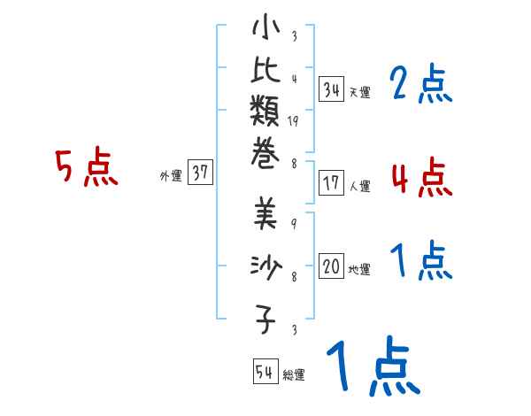 外運![]() | 小比類巻美沙子さんの外運は37画の5つ星!努力家で順応性に優れる。現実的な考え方ができ忠実に物事をこなす。 生活面を象徴する運勢です。外部から受ける影響力を表し、結婚運、家庭運や職場、環境への順応性を表します。 |