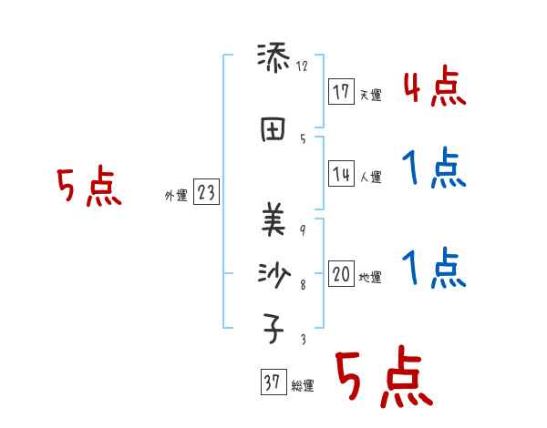 総運![]() | 添田美沙子さんの総運は37画の5つ星!努力家で順応性に優れる。現実的な考え方ができ忠実に物事をこなす。 あなたの人生を表す1番重要な運勢です。生涯を通じて影響する総合運となり、主に50歳以降の晩年期に影響を及ぼします。 |
