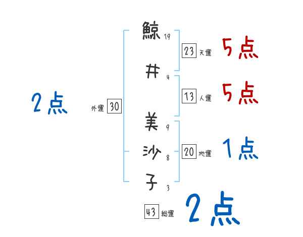 天運![]() | 鯨井美沙子さんの天運は23画の5つ星!想像力に優れ活力がある。一代で成功し名誉を手に入れる。 家系が持つ宿命的な運勢を表します。祖先から受け継いだ苗字ですので自分の力が及びません。家柄を象徴します。 |