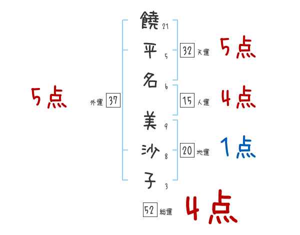 天運![]() | 饒平名美沙子さんの天運は32画の5つ星!柔軟性があり成功する。チャンスが多く金運が良い。 家系が持つ宿命的な運勢を表します。祖先から受け継いだ苗字ですので自分の力が及びません。家柄を象徴します。 |