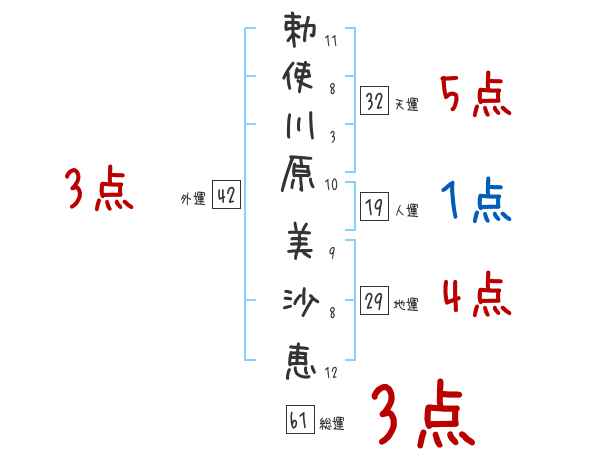 天運![]() | 勅使川原美沙恵さんの天運は32画の5つ星!柔軟性があり成功する。チャンスが多く金運が良い。 家系が持つ宿命的な運勢を表します。祖先から受け継いだ苗字ですので自分の力が及びません。家柄を象徴します。 |