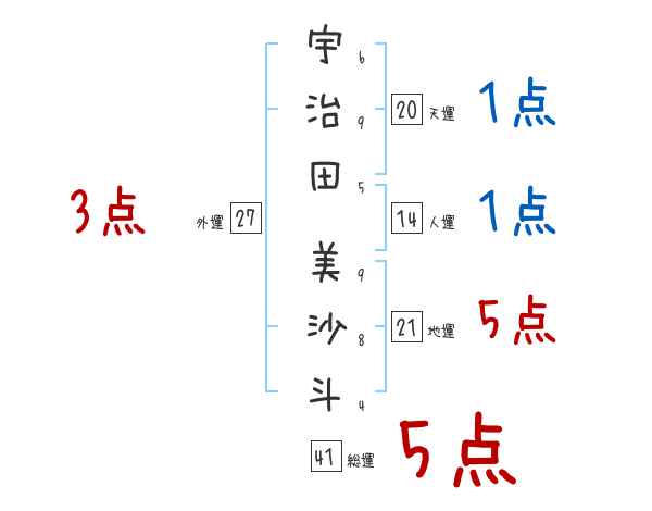 総運![]() | 宇治田美沙斗さんの総運は41画の5つ星!大志を抱き、目標に向かって実力を発揮し達成する。温和な性格。 あなたの人生を表す1番重要な運勢です。生涯を通じて影響する総合運となり、主に50歳以降の晩年期に影響を及ぼします。 |