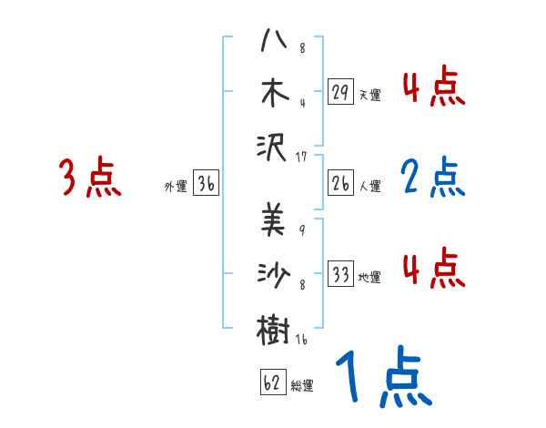 外運![]() | 八木沢美沙樹さんの外運は36画の3つ星!先見性が豊かです。多少神経質で苦労することも。 生活面を象徴する運勢です。外部から受ける影響力を表し、結婚運、家庭運や職場、環境への順応性を表します。 |