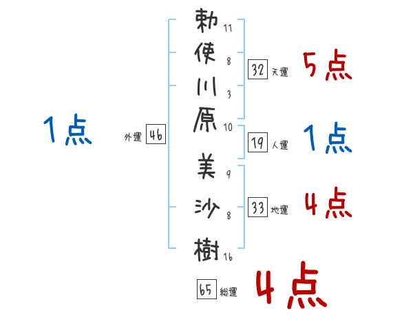 天運![]() | 勅使川原美沙樹さんの天運は32画の5つ星!柔軟性があり成功する。チャンスが多く金運が良い。 家系が持つ宿命的な運勢を表します。祖先から受け継いだ苗字ですので自分の力が及びません。家柄を象徴します。 |