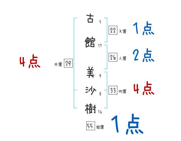 天運![]() | 古館美沙樹さんの天運は22画の1つ星!努力することが苦手ないっぽう手先が器用。芸術性にも優れる。 家系が持つ宿命的な運勢を表します。祖先から受け継いだ苗字ですので自分の力が及びません。家柄を象徴します。 |