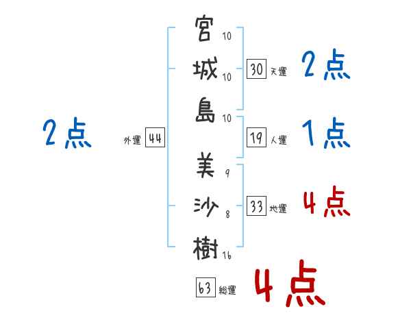 外運![]() | 宮城島美沙樹さんの外運は44画の2つ星!誠実で慎重な性格。物事を考えすぎないように注意しましょう。 生活面を象徴する運勢です。外部から受ける影響力を表し、結婚運、家庭運や職場、環境への順応性を表します。 |