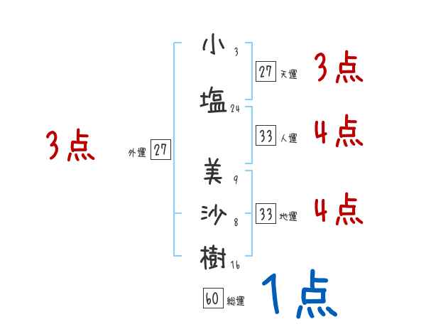 天運![]() | 小塩美沙樹さんの天運は27画の3つ星!頭脳明晰だが強情で摩擦が多い傾向。孤立に注意。 家系が持つ宿命的な運勢を表します。祖先から受け継いだ苗字ですので自分の力が及びません。家柄を象徴します。 |