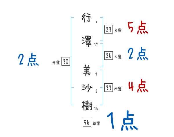 天運![]() | 行澤美沙樹さんの天運は23画の5つ星!想像力に優れ活力がある。一代で成功し名誉を手に入れる。 家系が持つ宿命的な運勢を表します。祖先から受け継いだ苗字ですので自分の力が及びません。家柄を象徴します。 |