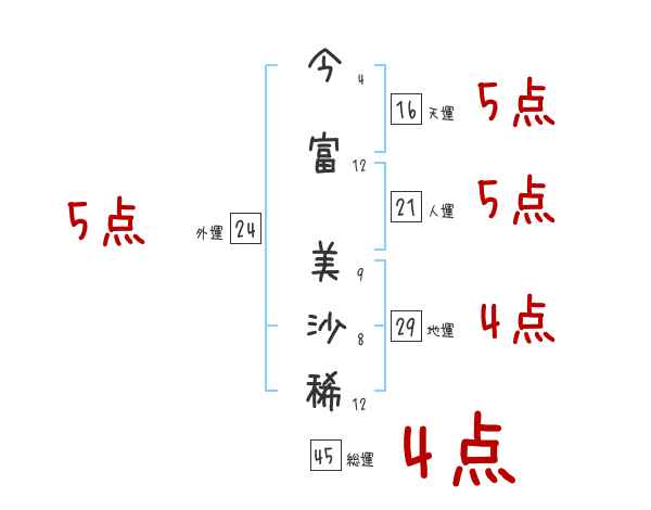 外運![]() | 今富美沙稀さんの外運は24画の5つ星!家庭運が良く順調な人生。金運にも恵まれる。 生活面を象徴する運勢です。外部から受ける影響力を表し、結婚運、家庭運や職場、環境への順応性を表します。 |