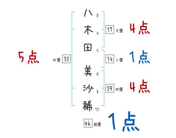 外運![]() | 八木田美沙稀さんの外運は32画の5つ星!柔軟性があり成功する。チャンスが多く金運が良い。 生活面を象徴する運勢です。外部から受ける影響力を表し、結婚運、家庭運や職場、環境への順応性を表します。 |