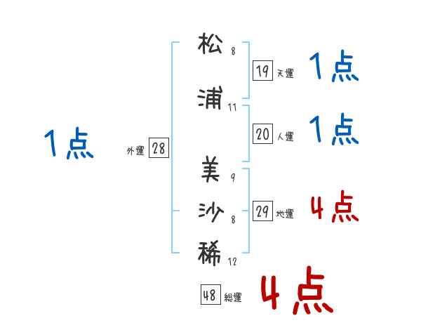 外運![]() | 松浦美沙稀さんの外運は28画の1つ星!家庭環境に注意。スポーツで活躍できる能力があるかも。 生活面を象徴する運勢です。外部から受ける影響力を表し、結婚運、家庭運や職場、環境への順応性を表します。 |