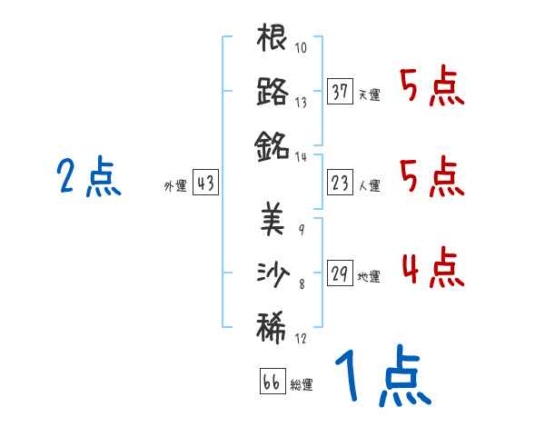 根路銘美沙稀さんの画数の鑑定結果