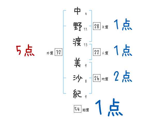 外運![]() | 中野渡美沙紀さんの外運は32画の5つ星!柔軟性があり成功する。チャンスが多く金運が良い。 生活面を象徴する運勢です。外部から受ける影響力を表し、結婚運、家庭運や職場、環境への順応性を表します。 |