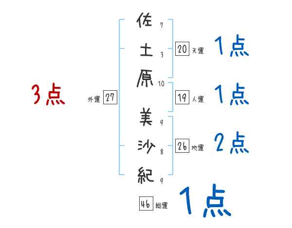 外運![]() | 佐土原美沙紀さんの外運は27画の3つ星!頭脳明晰だが強情で摩擦が多い傾向。孤立に注意。 生活面を象徴する運勢です。外部から受ける影響力を表し、結婚運、家庭運や職場、環境への順応性を表します。 |